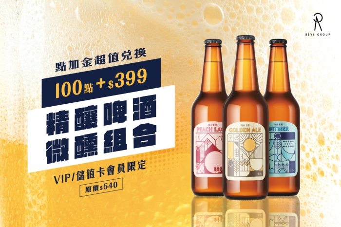 |活動說明:儲值卡、VIP會員至APP【優惠票券區】,以扣紅利點數100點+實體門市付款$399方式,兌換價值 $540的「精釀啤酒微醺組合」。